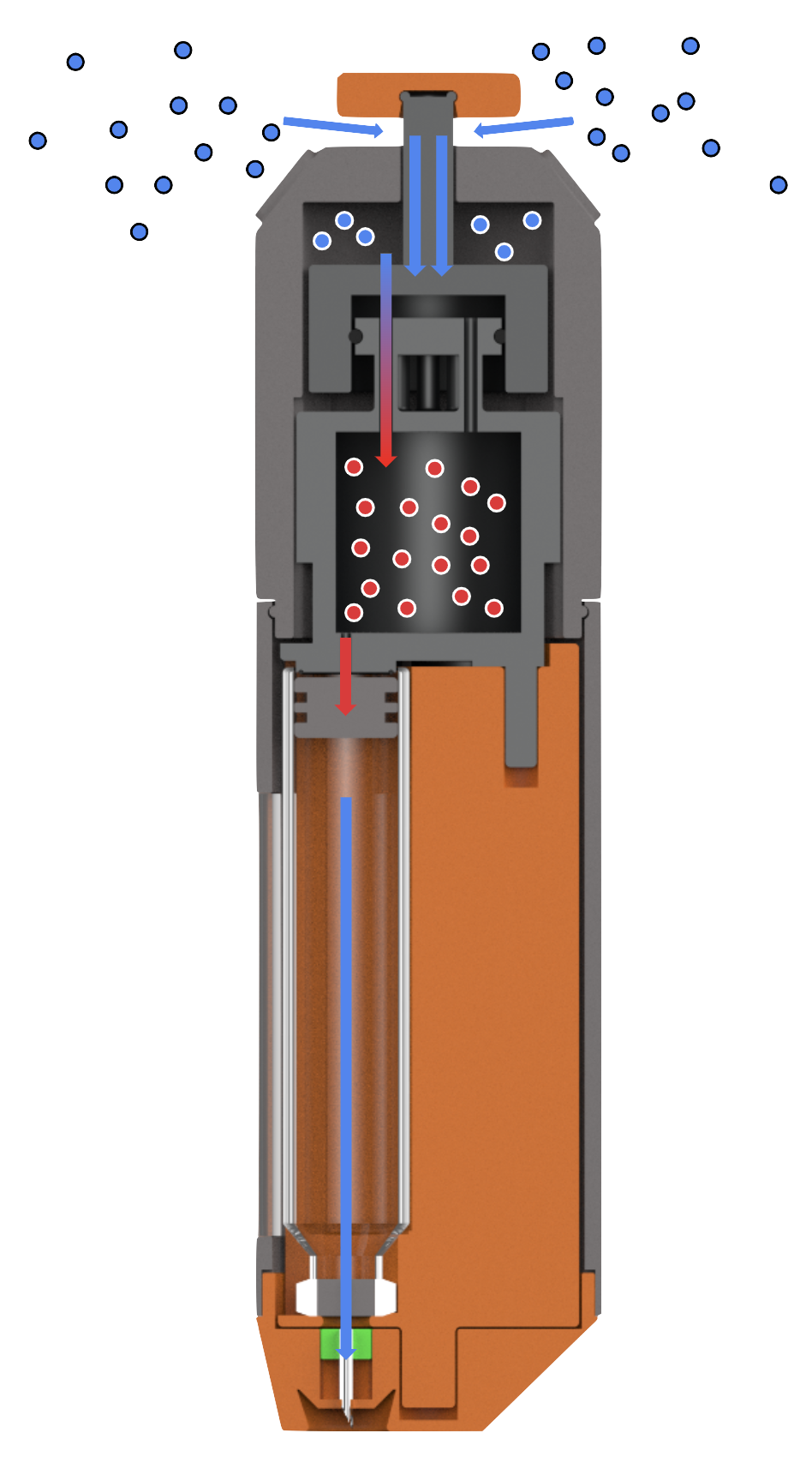Pressurized air releases, pushing the rubber stopper, which lowers the needle and releases the medication