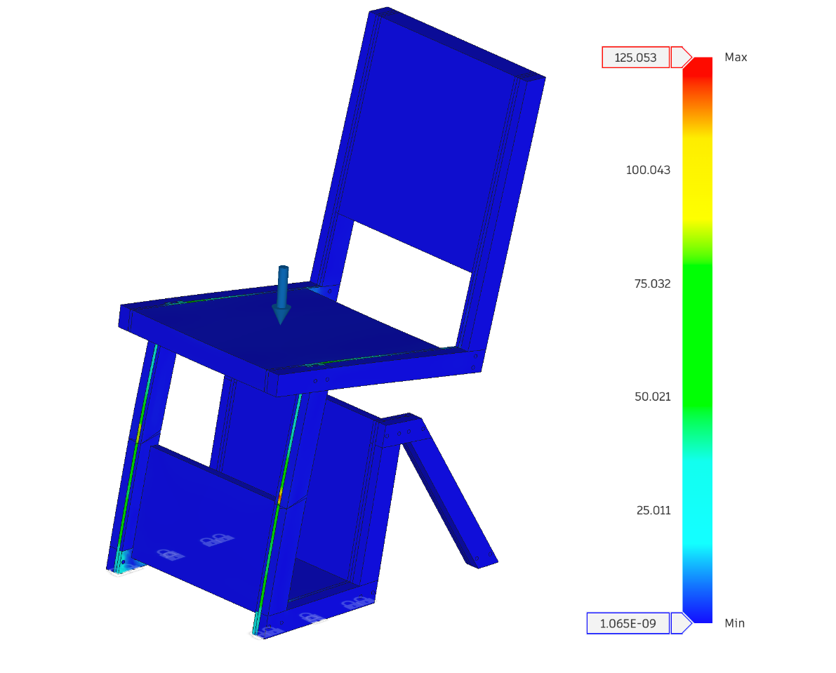 Static structural FEA (von Mises) with a 3000 N distributed seat load (≈675 lbf, ≈306 kg-equiv) mapped stress concentrations across the frame and joints.