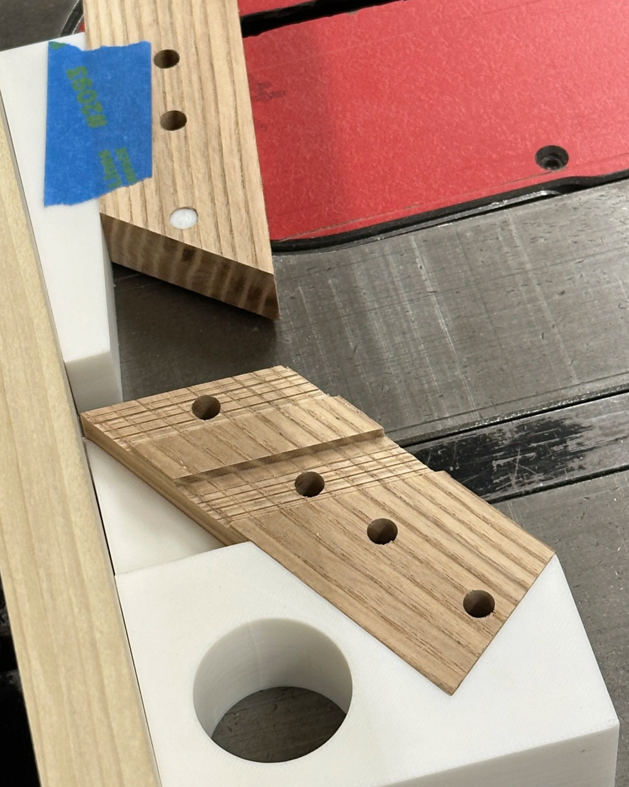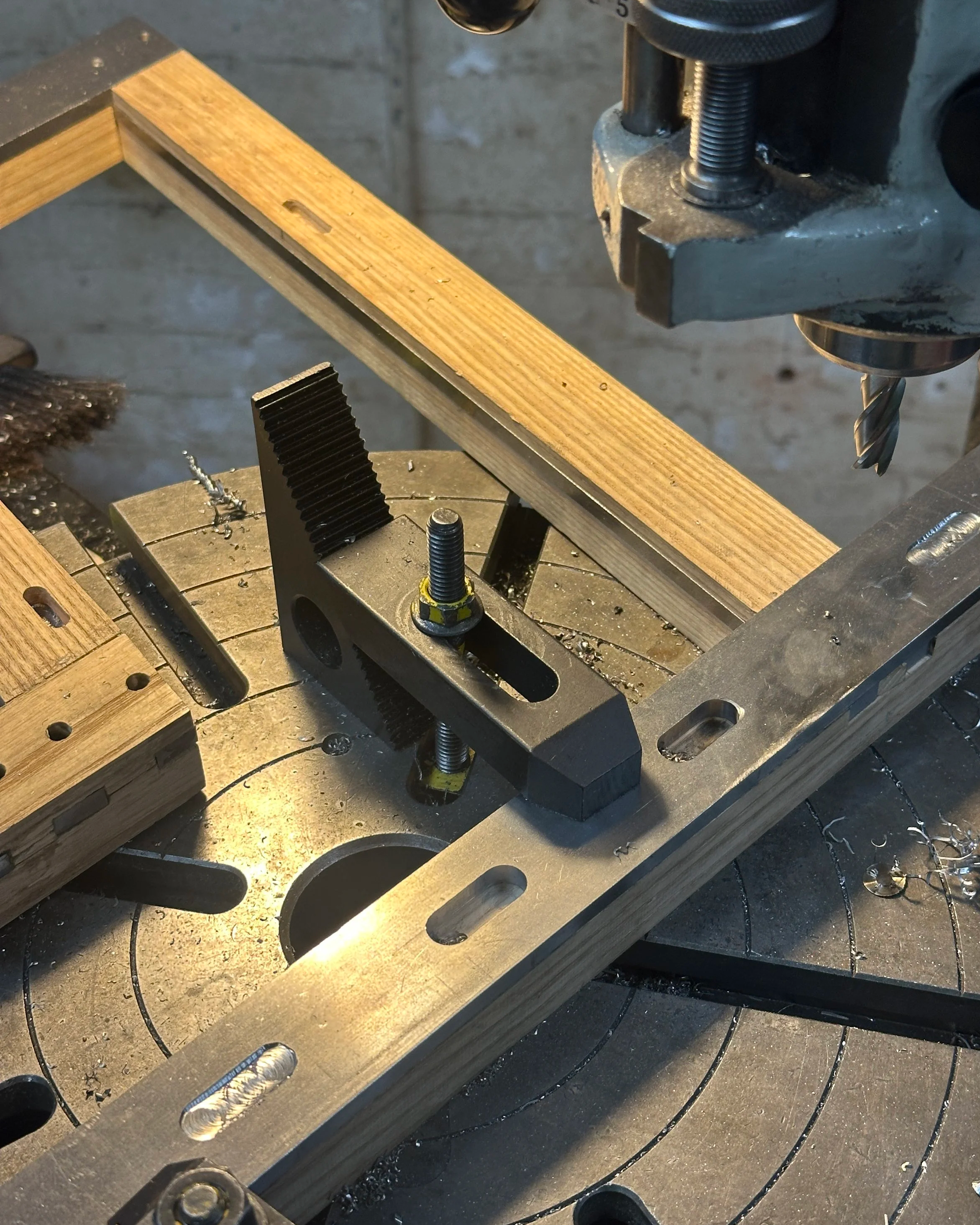 Cantilevered form is supported by a manually milled steel frame with press-fitted joints. 3D-printed jigs guided complex cuts and drilling.