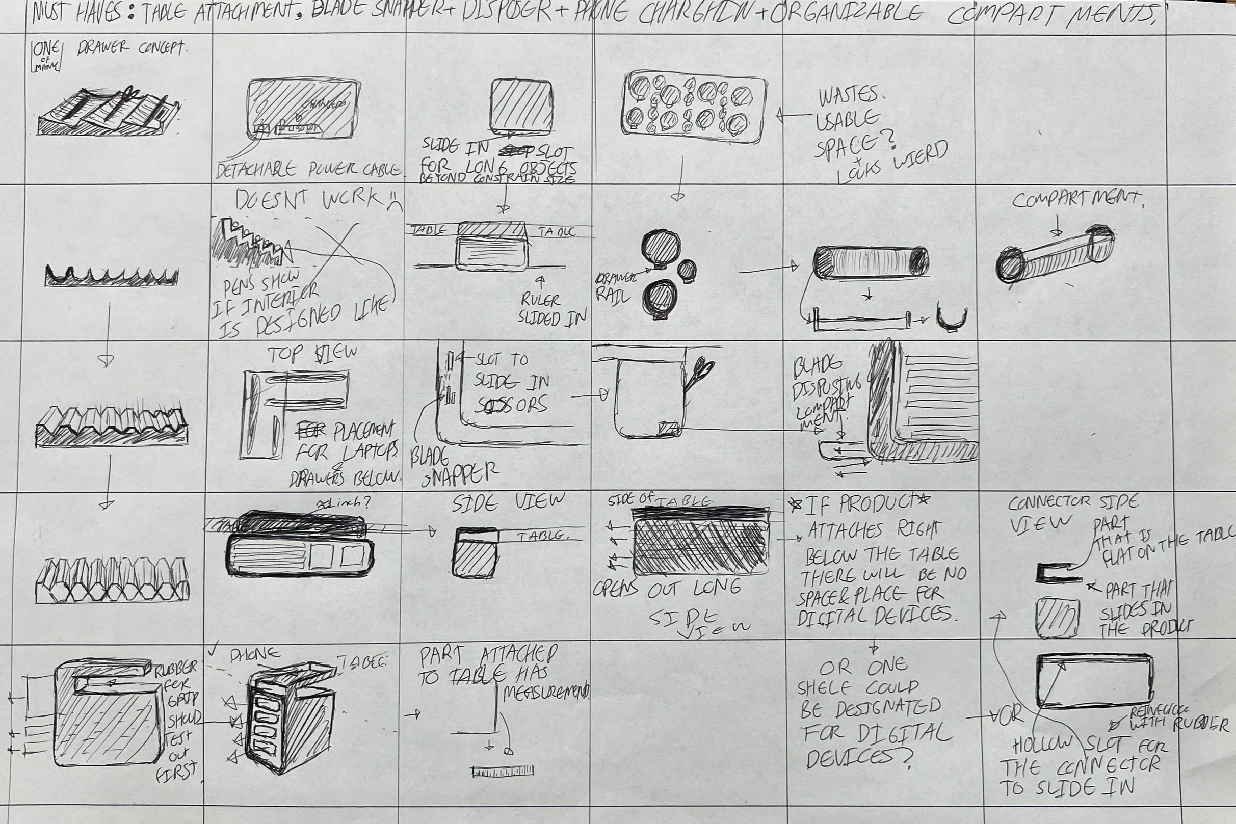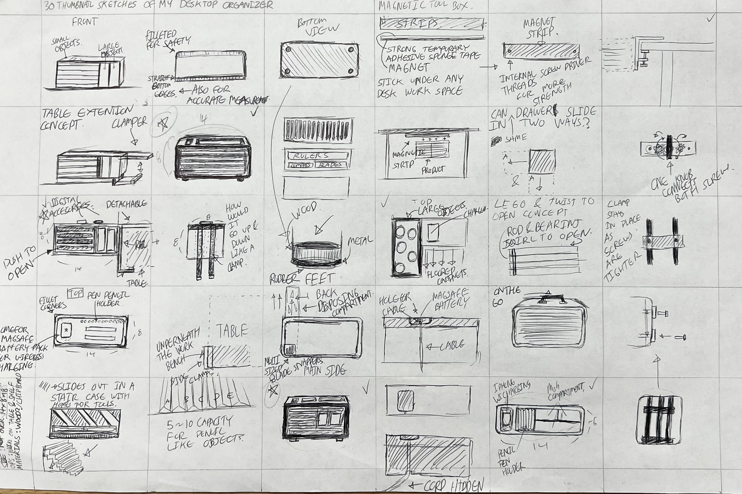 Early sketches tested shelves, clamps, and modular compartments, aiming to reduce desk clutter, assign homes for tools, and explore both functional and organic forms