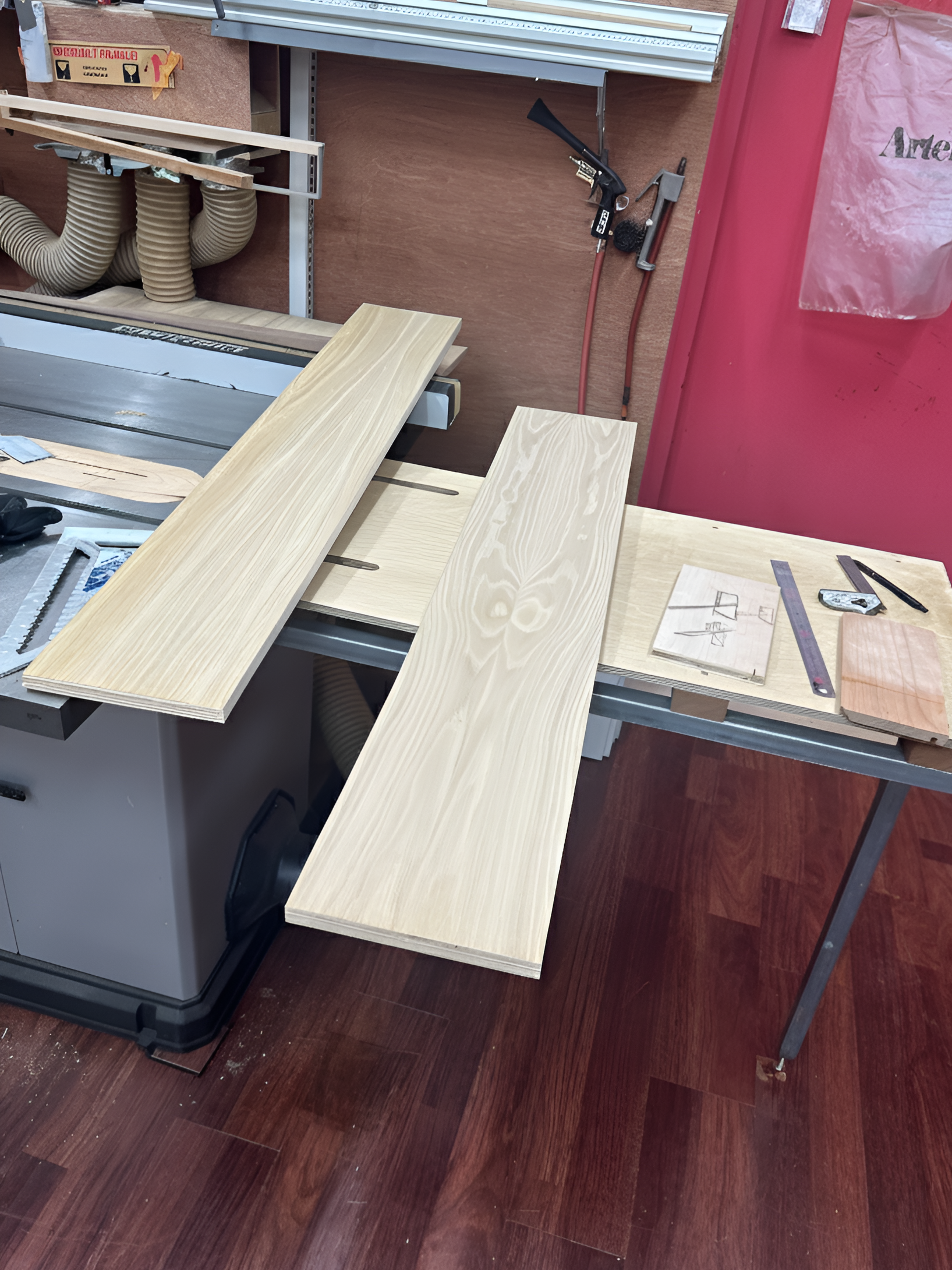 Two × 8″×40″×¾″ boards · miter saw + band saw only + nail gun · 6 hours